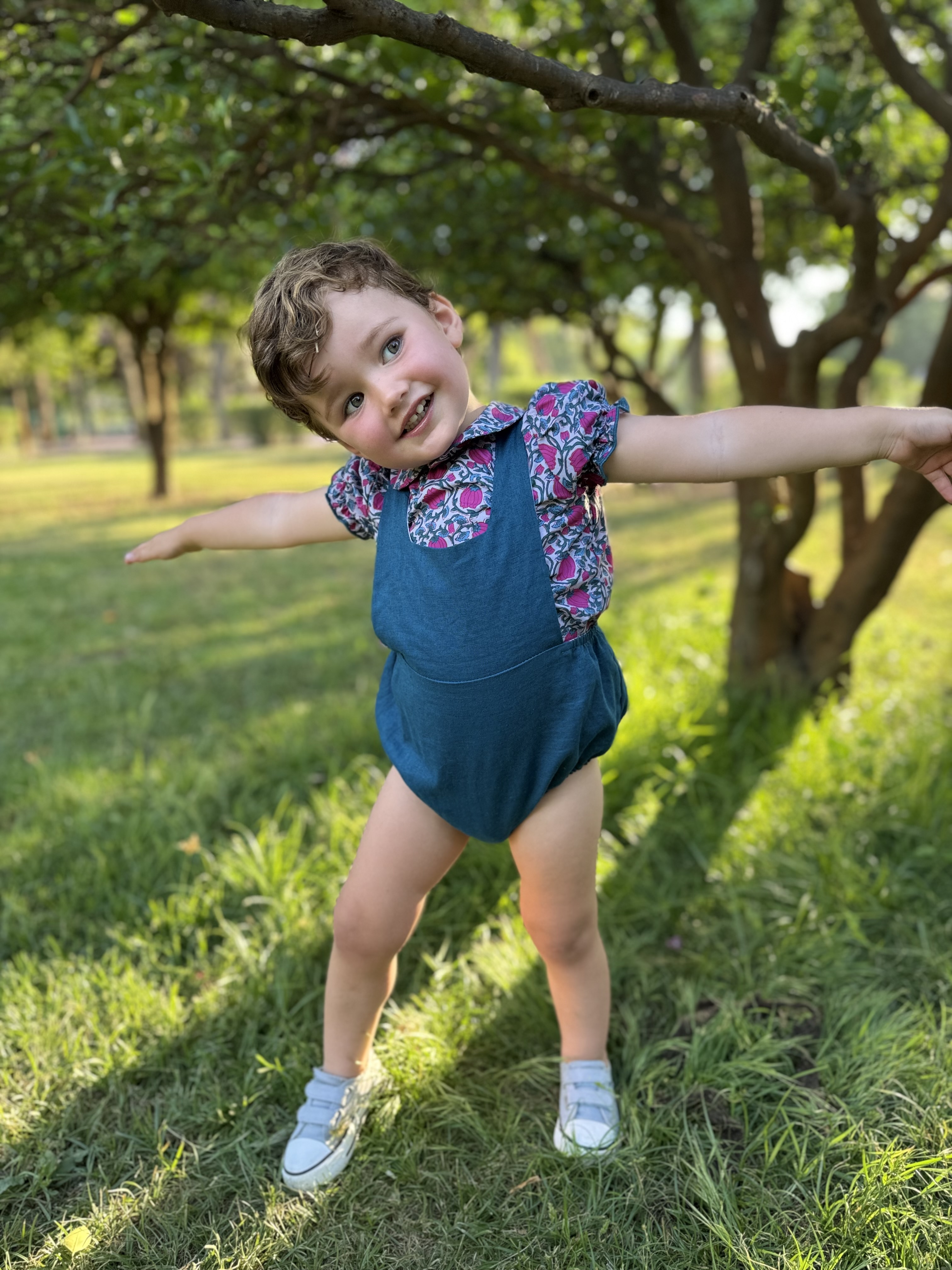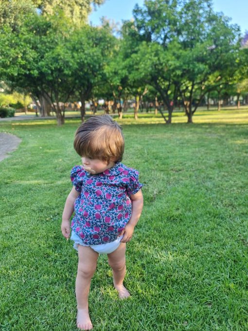 Blusa cuello bebé abotonada en la espalda con botones de nácar, manga de farol con goma para adaptarse con facilidad.