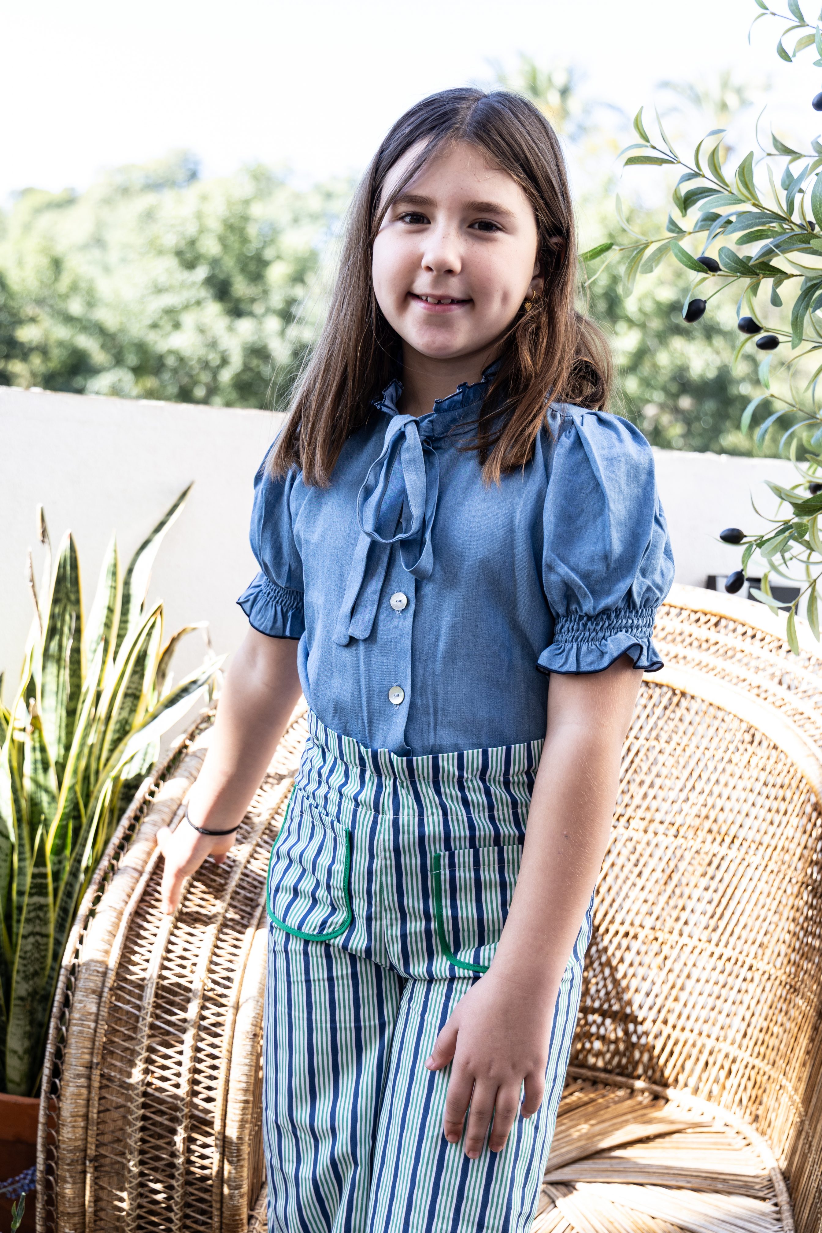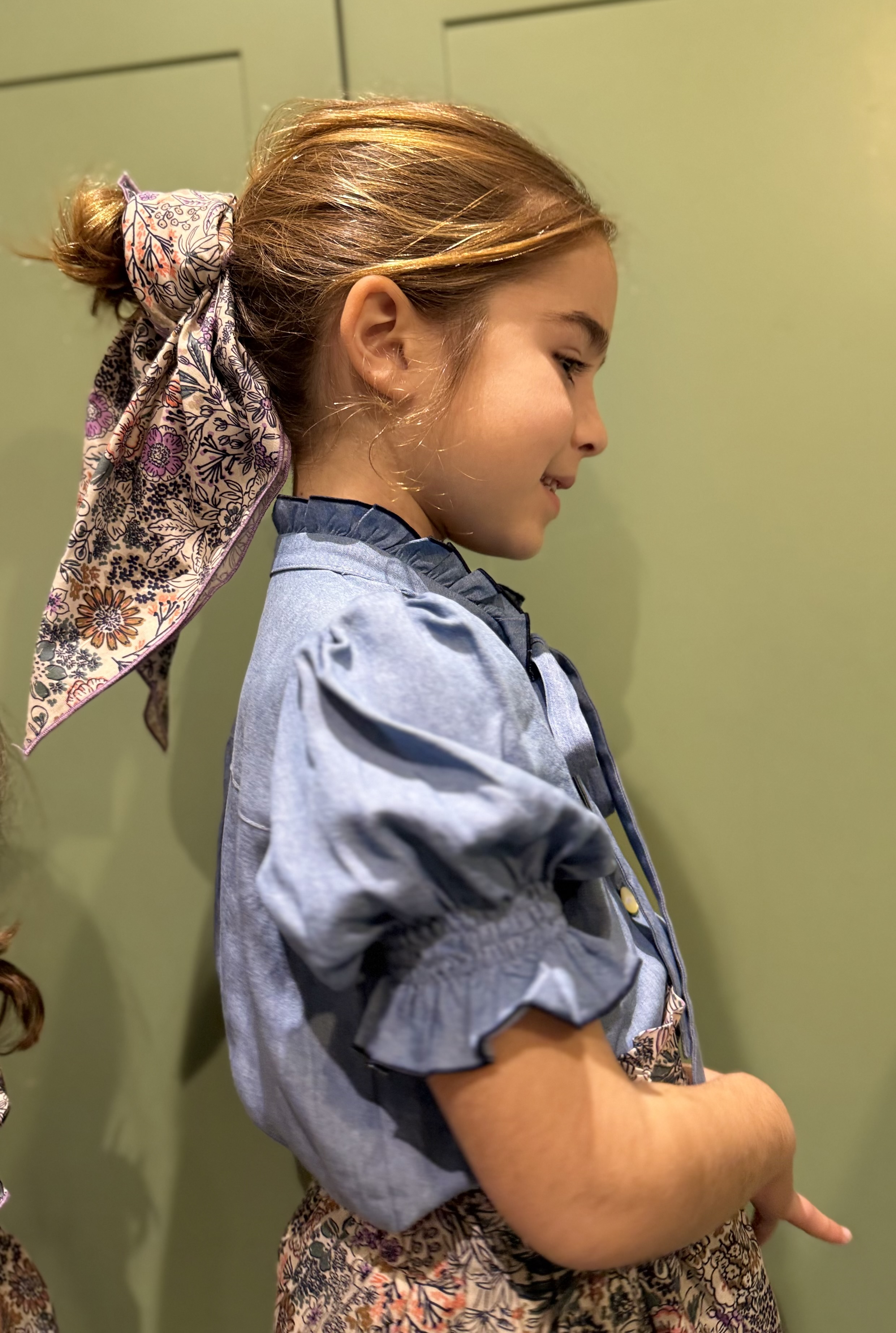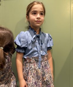 Blusa abotonada en la parte delantera con lazada en el cuello y volante, tiene frunces en la parte delantera y trasera en el canesú para que quede holgadita y pueda usarla varias temporadas