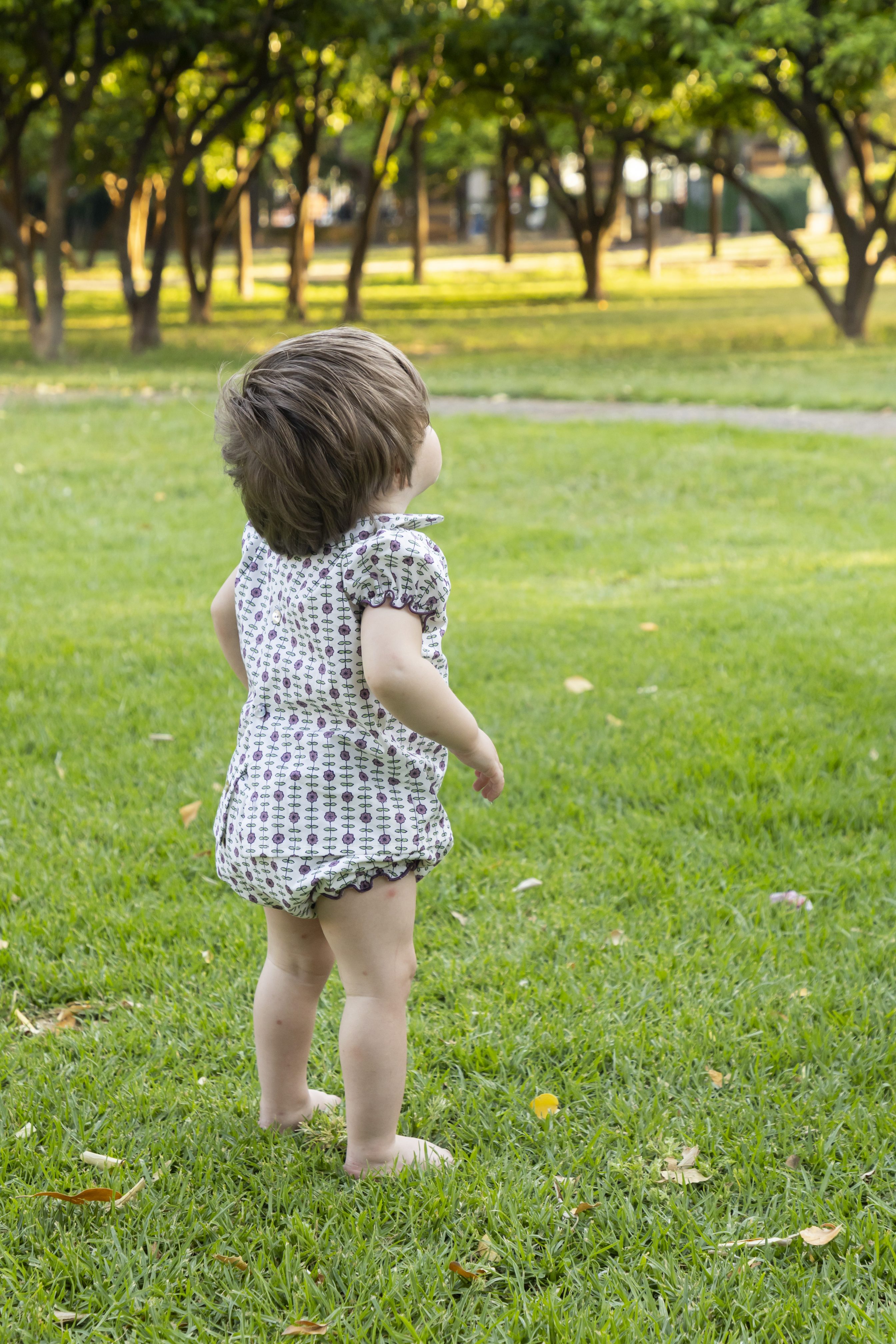 Blusa cuello bebé abotonada en la espalda con botones de nácar, manga de farol con goma para adaptarse con facilidad.