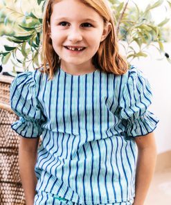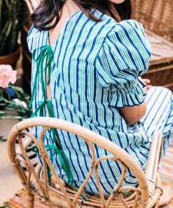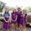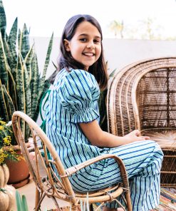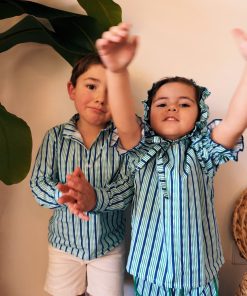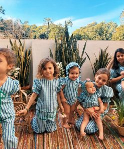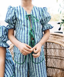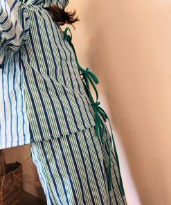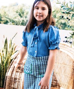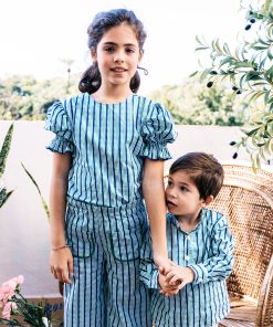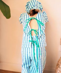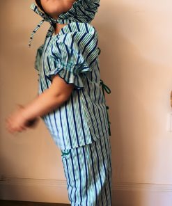 Conjunto de pantalón con cintura completamente engomada y dos bolsillos delanteros y blusa con manga farol y se abrocha en la parte delantera o trasera con lazadas.