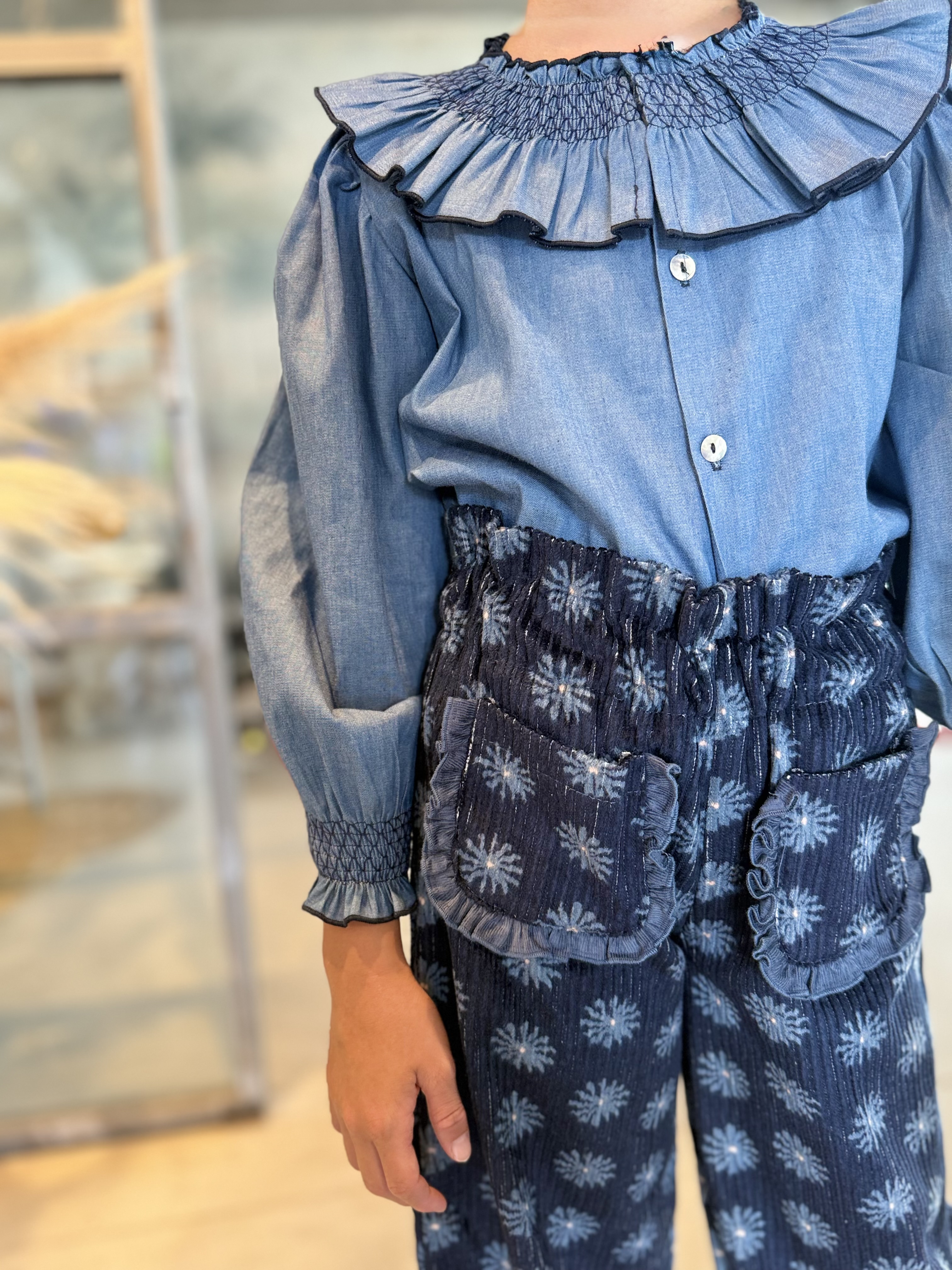 Pantalón ancho con cintura con volante engomada y dos bolsillos delanteros