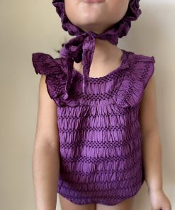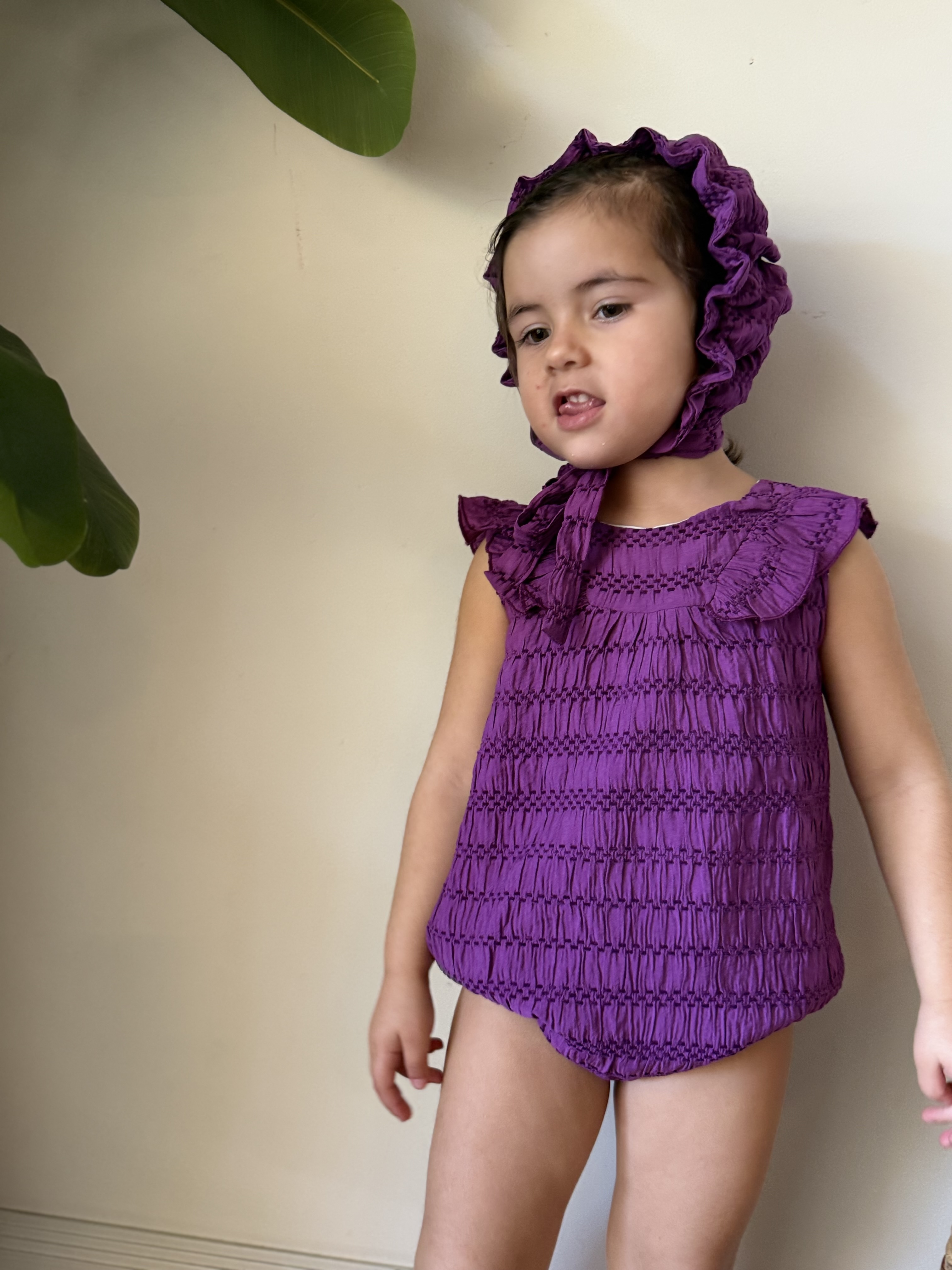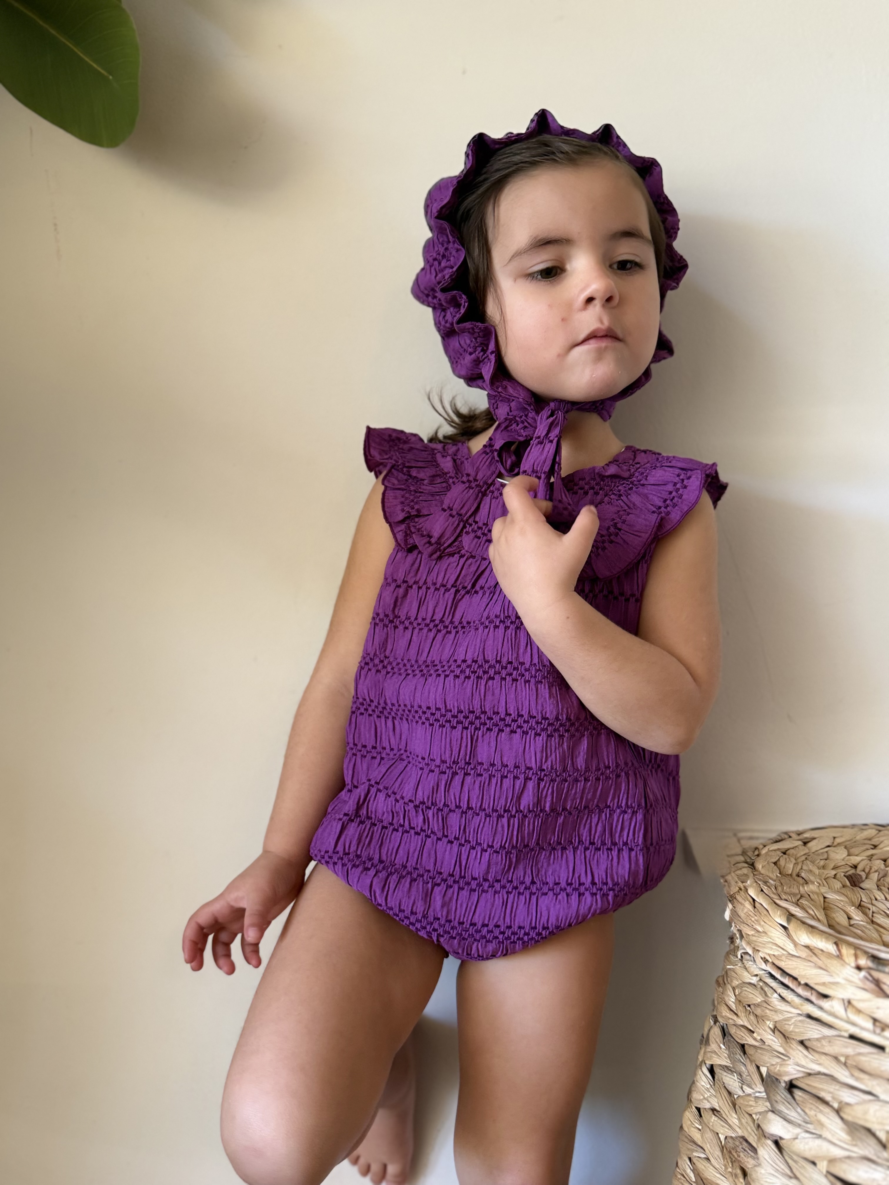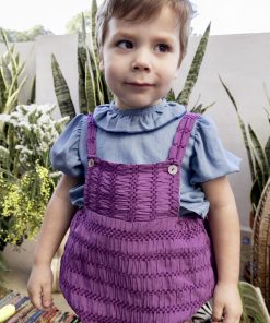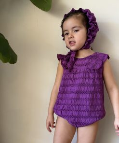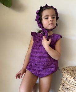 Pelele con a la sisa con doble volante en pate delantera y trasera abotonado en la espalda y lleva botones para facilitar el cambio de pañal.