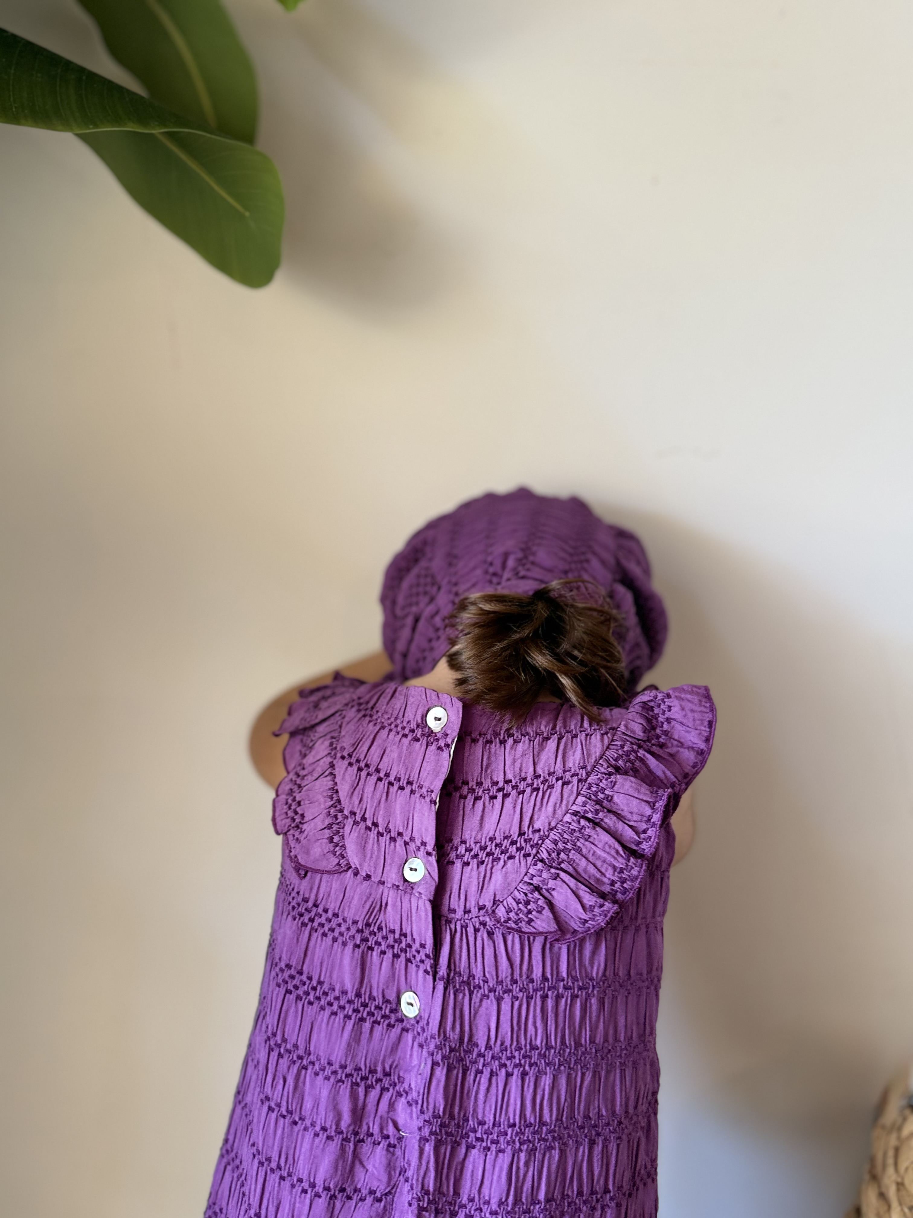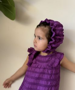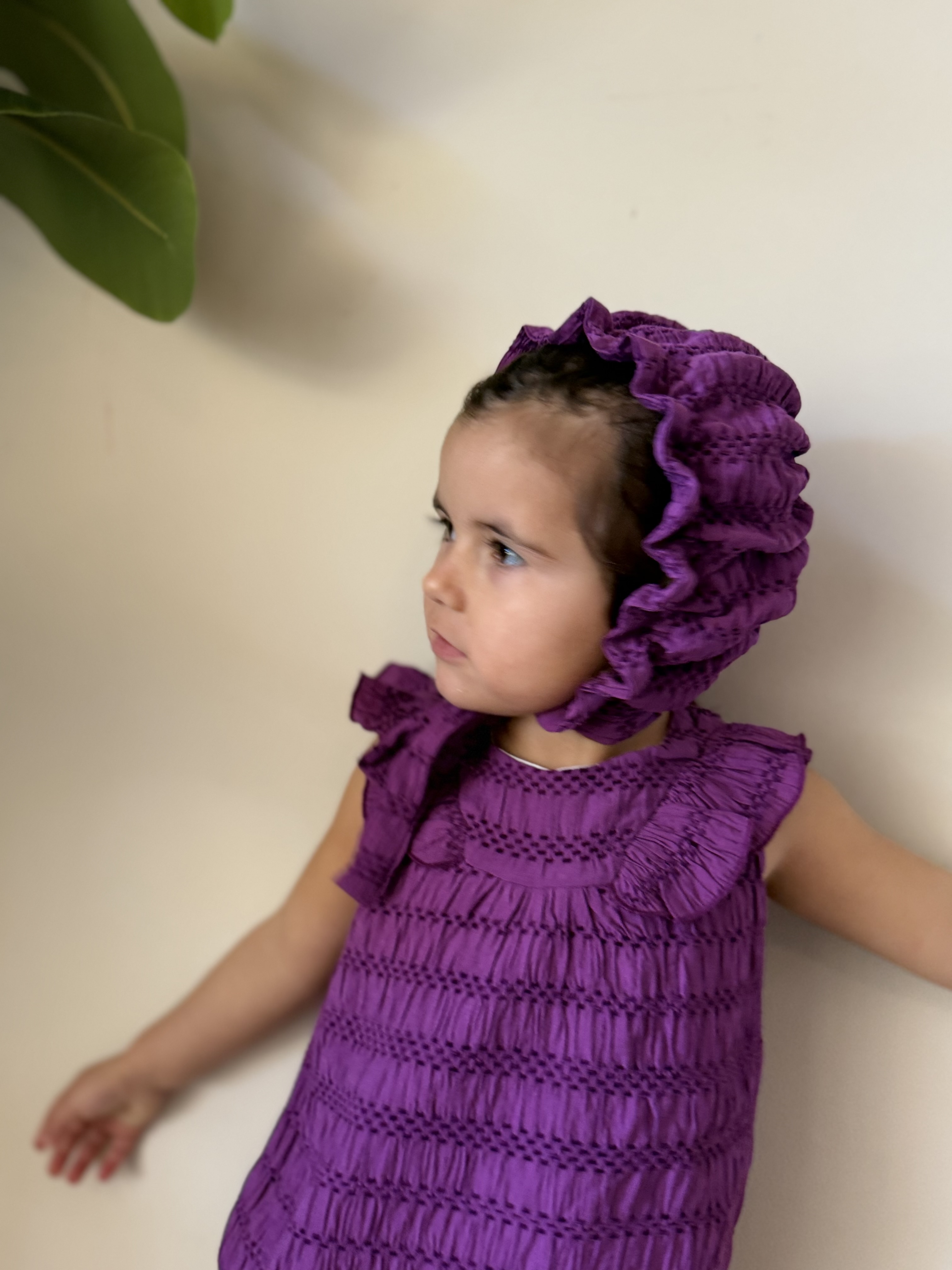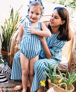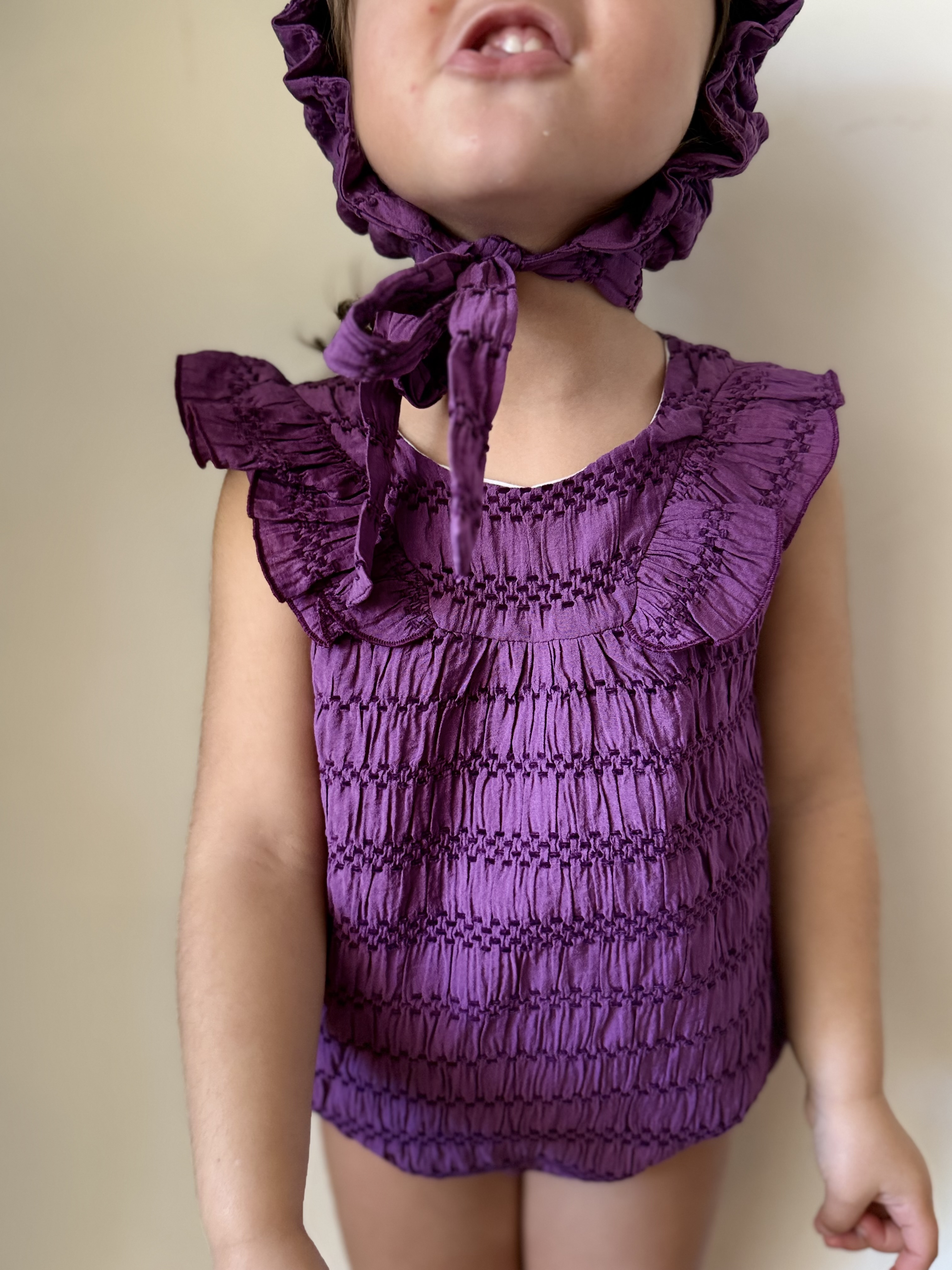 Pelele con a la sisa con doble volante en pate delantera y trasera abotonado en la espalda y lleva botones para facilitar el cambio de pañal.