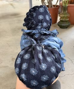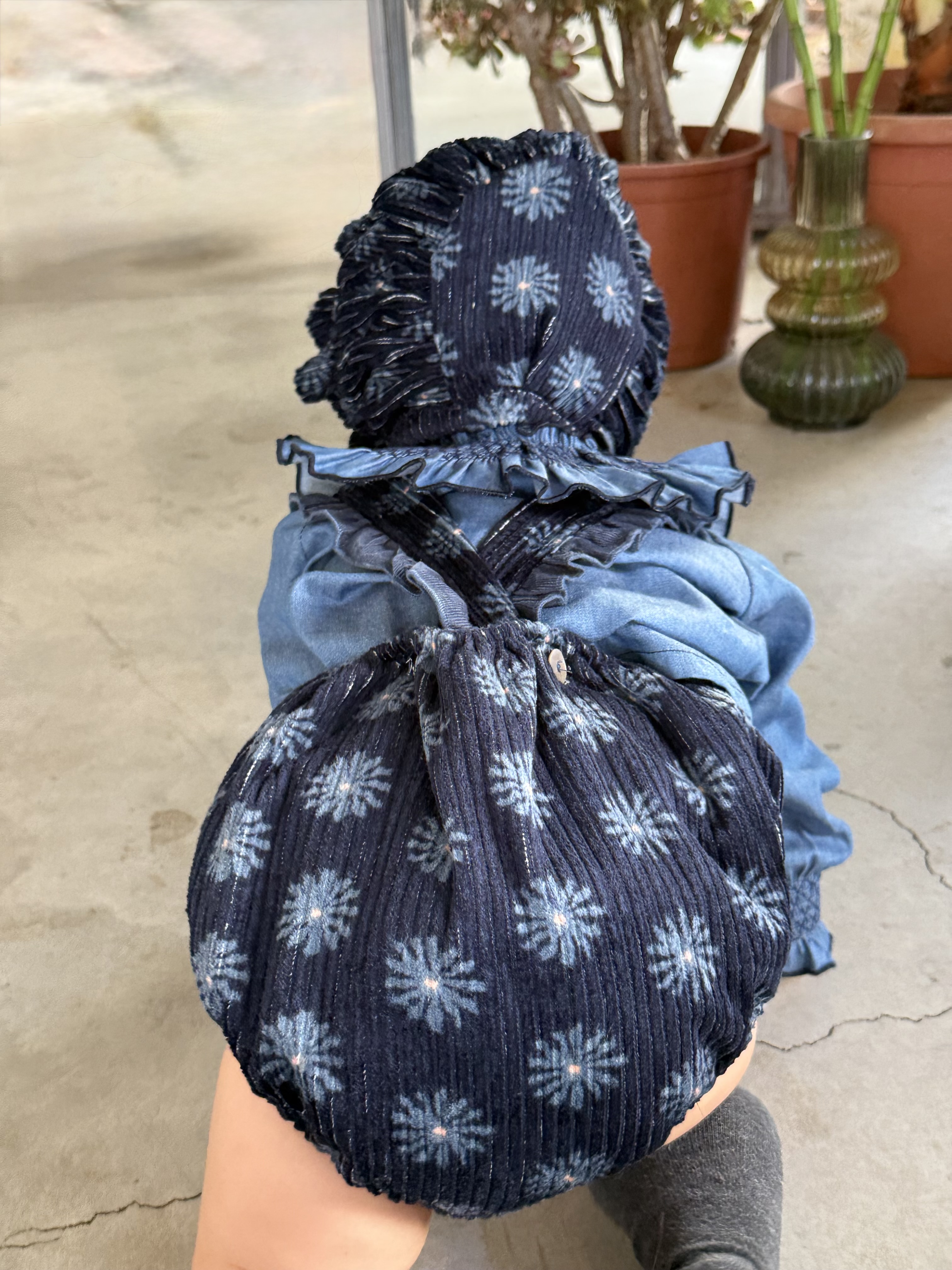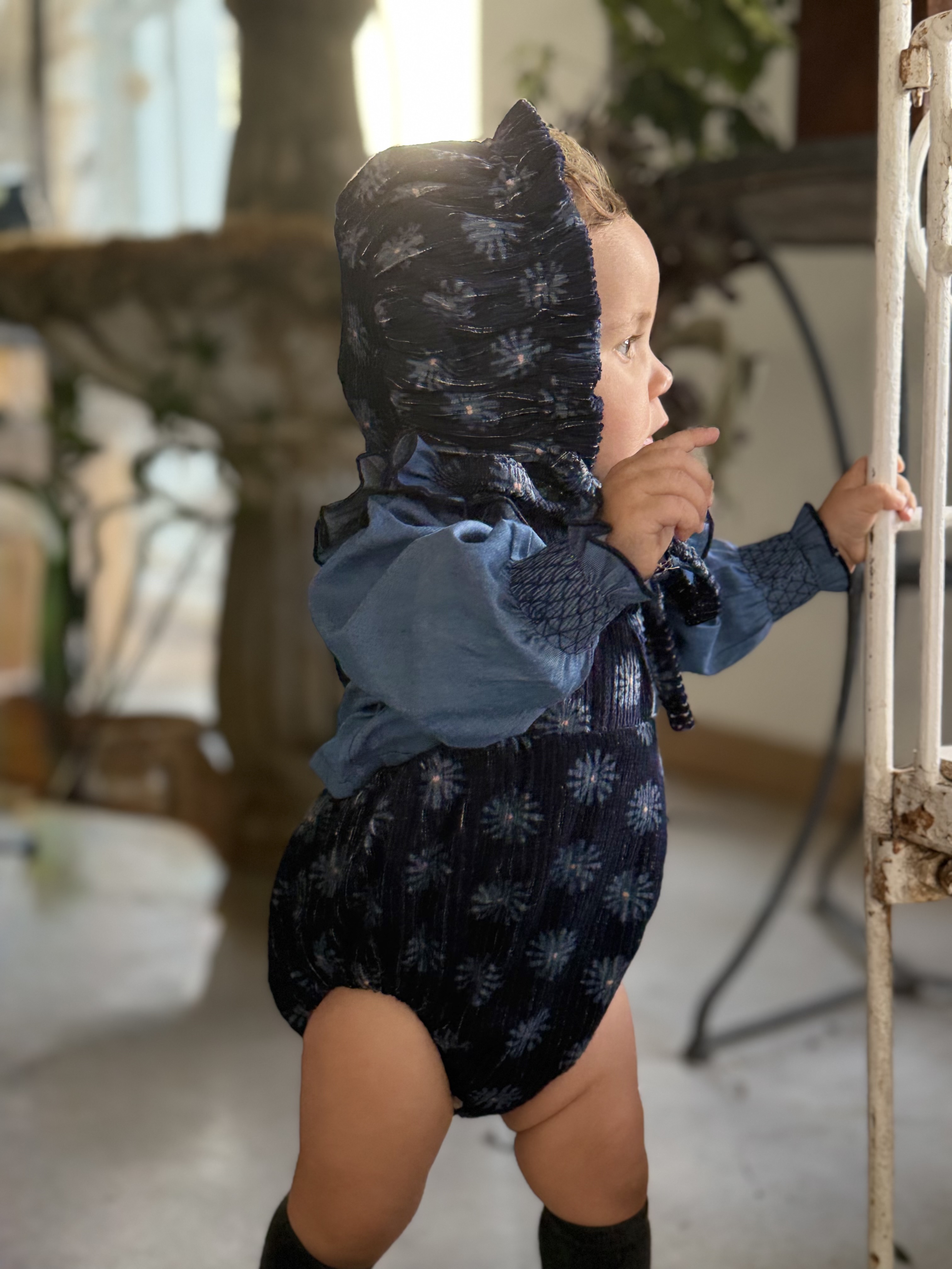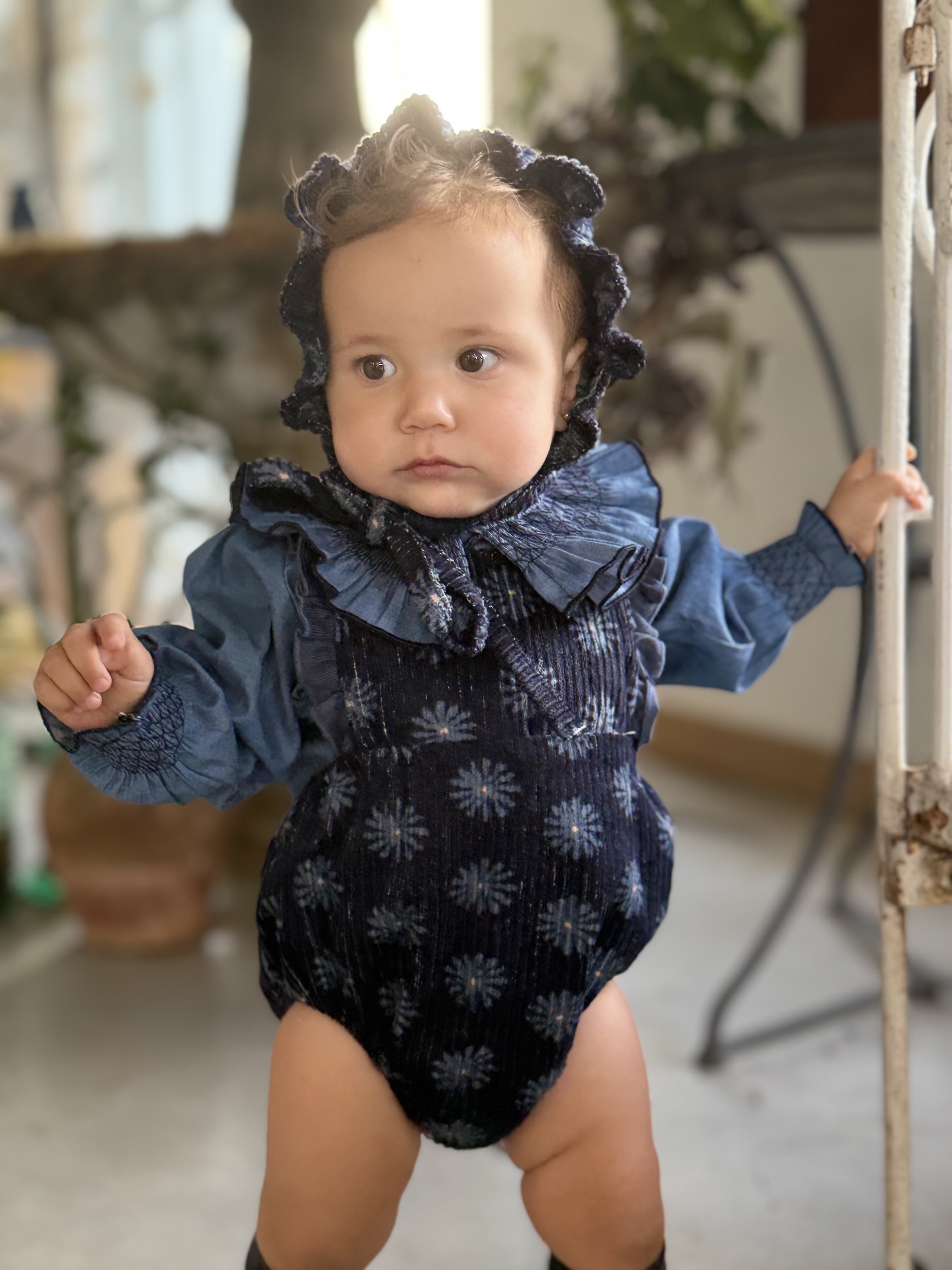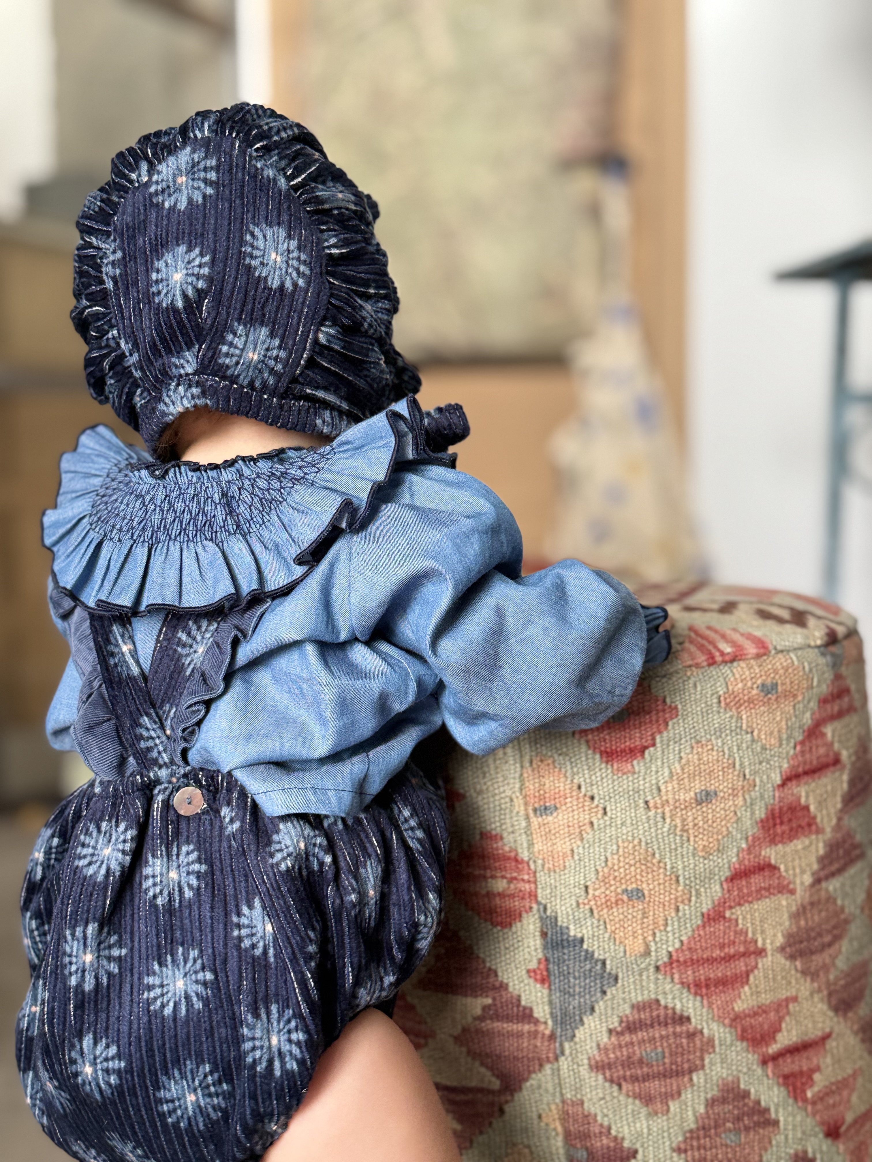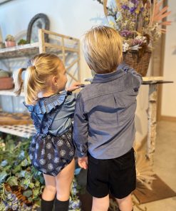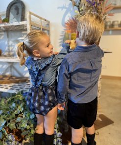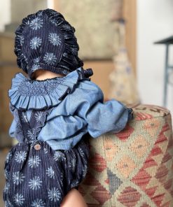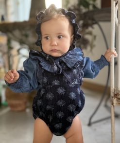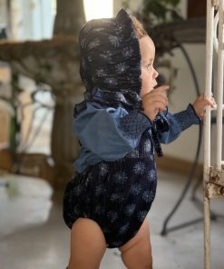 Ranita con tirantes con volante en micropana azulona y botones. en la parte inferior lleva botones para facilitar el cambio de pañal.