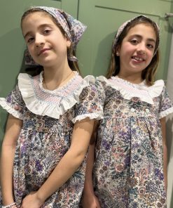 Vestido de manga corta con cuello de batista con punto smock botones delanteros de adorno, se abrocha en la espalda.